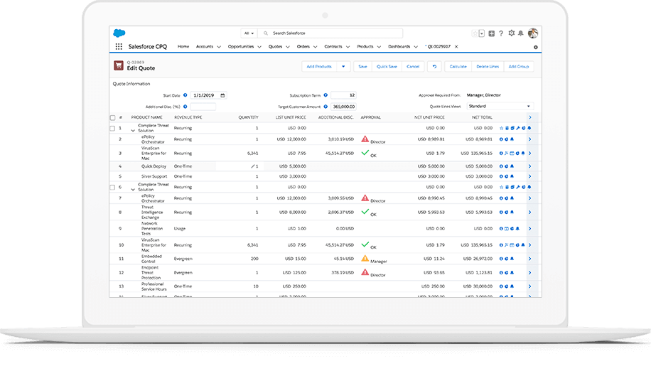 Vous devez trouver le bon prix pour les produits que vous vendez, et CPQ est la source de référence pour la tarification. Vous et vos commerciaux pouvez appliquer des remises personnalisées en laissant l’outil s’occuper du reste, notamment les calculs.